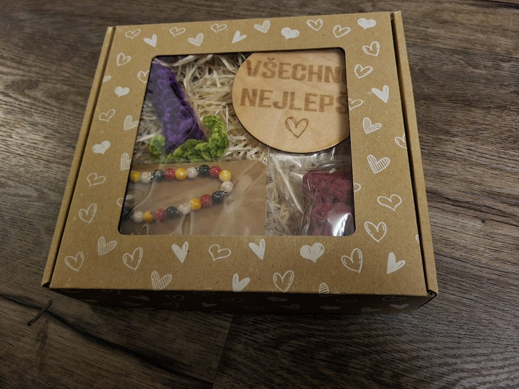 Dárková kazeta obsahuje náramek, medvídka ze svíčky, háčkovanou kytičku a gravírovaný podtácek. Na přání můžeme vygravírovat váš text na podtácek, stačí napsat do poznámek, co si přejete a my vám to rádi splníme.