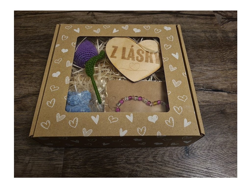 Dárková kazeta obsahuje náramek, medvídka ze svíčky, háčkovanou kytičku a gravírovaný podtácek. Na přání můžeme vygravírovat váš text na podtácek, stačí napsat do poznámek, co si přejete a my vám to rádi splníme.